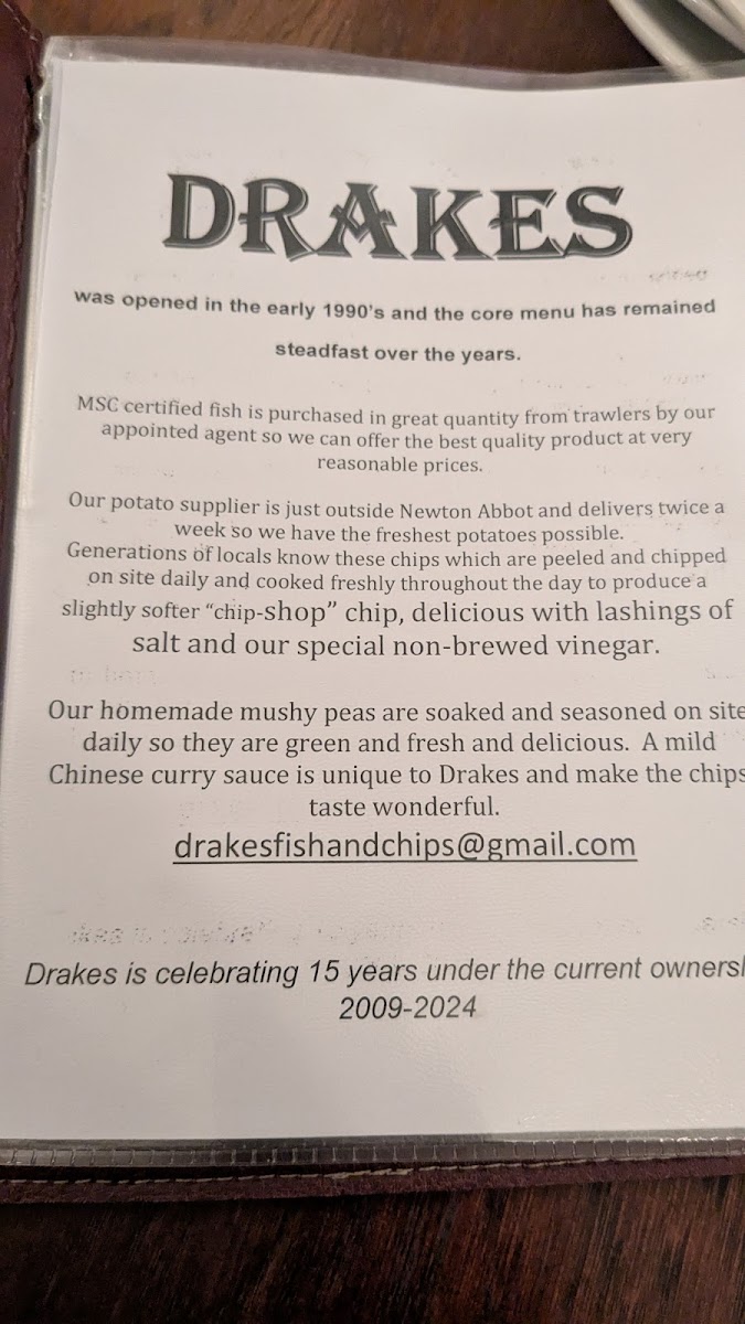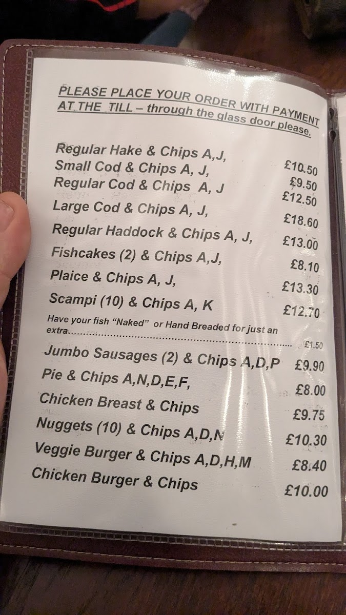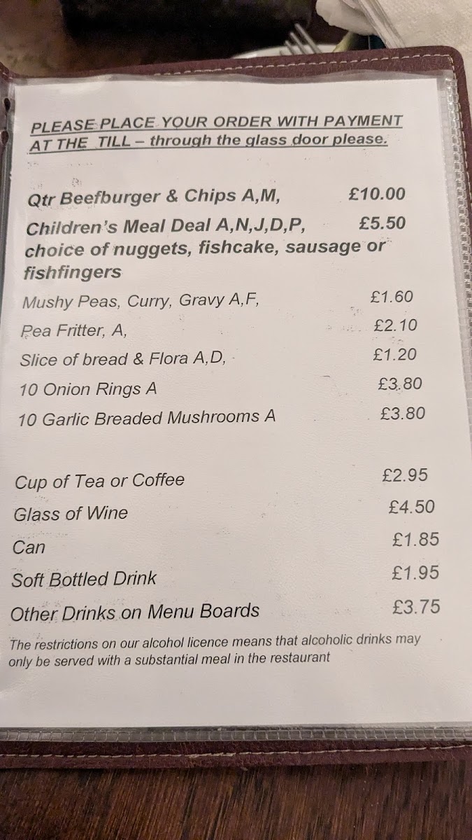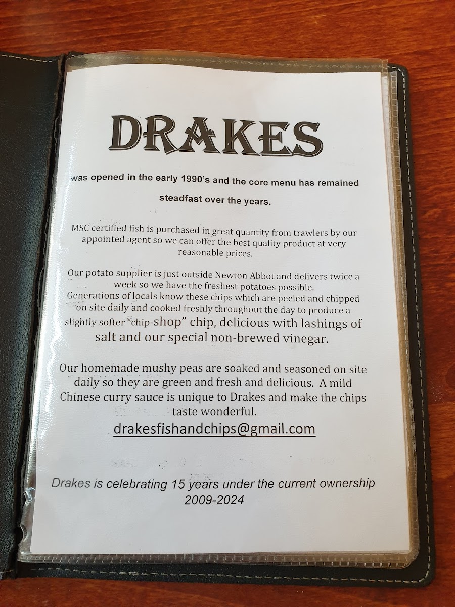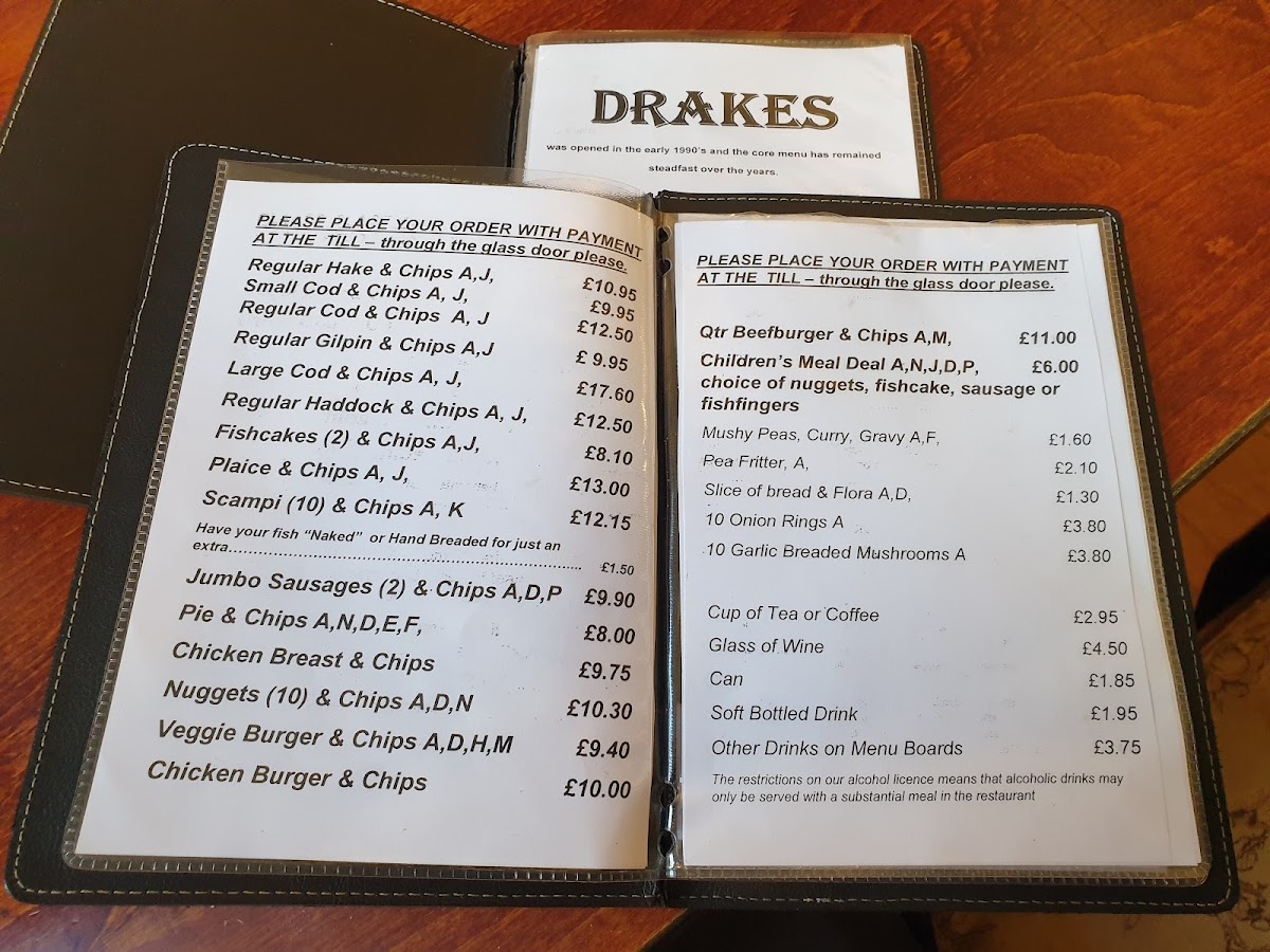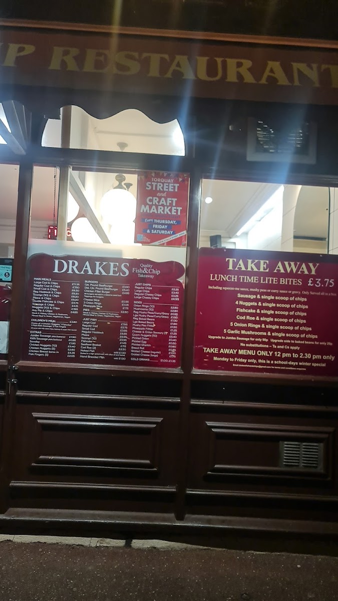 From a reviewer’s perspective, the menu at Drakes Fish & Chips Takeaway & Restaurant offers a classic seaside selection with something for every appetite. The main meals feature generous portions such as the Lorge Cod & Chips, Regular Cod & Chips, and Small Cod & Chips, alongside Reg Haddock & Chips and Scompi (10) & Chips, catering to both hearty and lighter appetites. For those seeking extra treats, items like Savaloy, Chicken Nuggets, Chicken Breast, and Fish Fingers provide satisfying add-ons, while burger enthusiasts can enjoy the Qtr. Pound Beefburger with optional Cheese Slice, 3 Onion Rings, or a Pineapple Slice. The “Just Fish” section highlights fresh options like Regular Cod, Regular Haddock, and a Seafood Basket, ideal for purists. A range of sides, including Onion Rings, Mushrooms, Pickled Gherkin, Grated Cheese, and Mushy Pea Fritte, complement the mains perfectly. For simpler meals or quick bites, offerings such as Sausage & Single Scoop Of Chips, 4 Nuggets & Single Scoop Of Chips, Fishcake & Single Scoop Of Chips, Cod Roe & Single Scoop Of Chips, and 5 Onion Rings & Single Scoop Of Chips round out the menu, demonstrating the restaurant’s attention to variety and traditional British flavors. Overall, the menu balances generous portions, classic seafood favorites, and familiar comfort foods, making it a dependable choice for both locals and visitors seeking a traditional fish and chip experience.